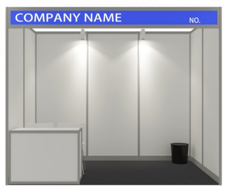 标配:英文楣板、三面/两面围板、一张咨询台、两把椅子、两盏照明灯、一个220V电源、地毯。